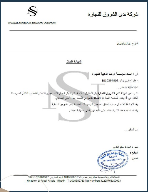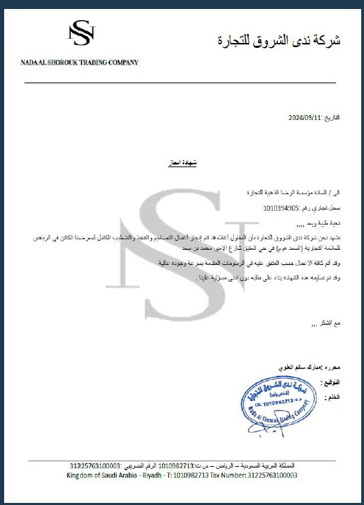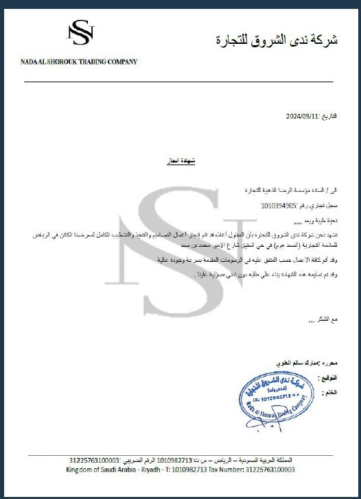 AlRidha AlDhahabiya for Contracting Establishment has successfully completed multiple contracting and project works for Nada Al Shorouk Trading Company, demonstrating high standards of performance, reliability, and technical capability.