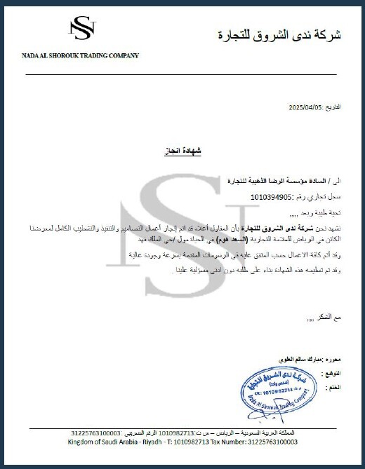 Nada Al Shorouk Trading Company – Work Completion Certificate